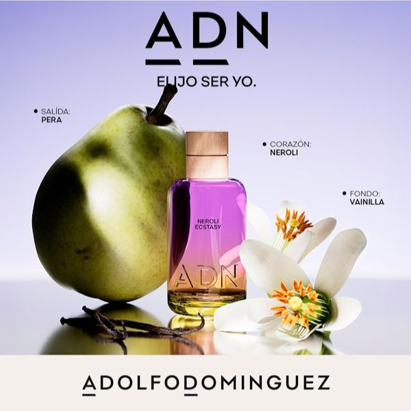 Neroli Ecstasy es parte de la nueva colección, ADN, de Adolfo Domínguez. Una colección de Eau de Parfum, genderless, a base de aceites esenciales que potencian tu identidad.