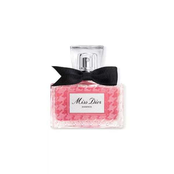 Miss Dior Essence se reafirma y reconecta con su identidad original, reinterpretando el frasco tradicional creado en 1948 por Christian Dior: un motivo de pata de gallo esmerilado y un lazo poignard de grogrén negro fabricado en Francia adornan un precioso tapón de cristal.