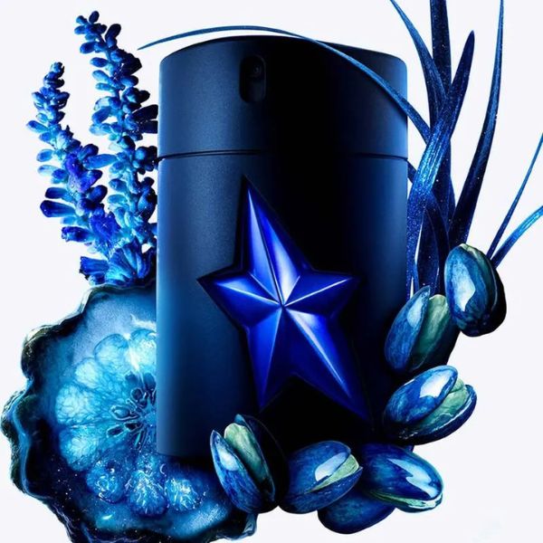 La botella negra, suave y táctil, está adornada con una llamativa estrella facetada de color azul cobalto. una evolución llameante del color cósmico que siempre ha sido propiedad de Mugler.