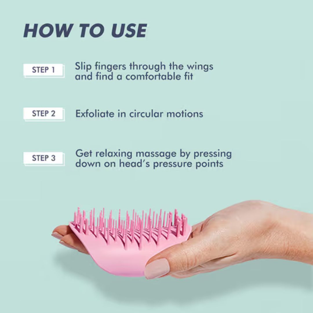 Use Tangle Teezer The Scalp Exfoliator & Massager solo, con champú, cualquier tratamiento para el cabello o aceite. Comience deslizando los dedos por las alas y encuentre una posición cómoda. Luego, use la herramienta para distribuir el producto por su cuero cabelludo y puntas. Muévalo con movimientos circulares, controlando el nivel de presión y masajee hasta por tres minutos. Esta herramienta no es adecuada para desenredar, cuero cabelludo sensible o piel rota.